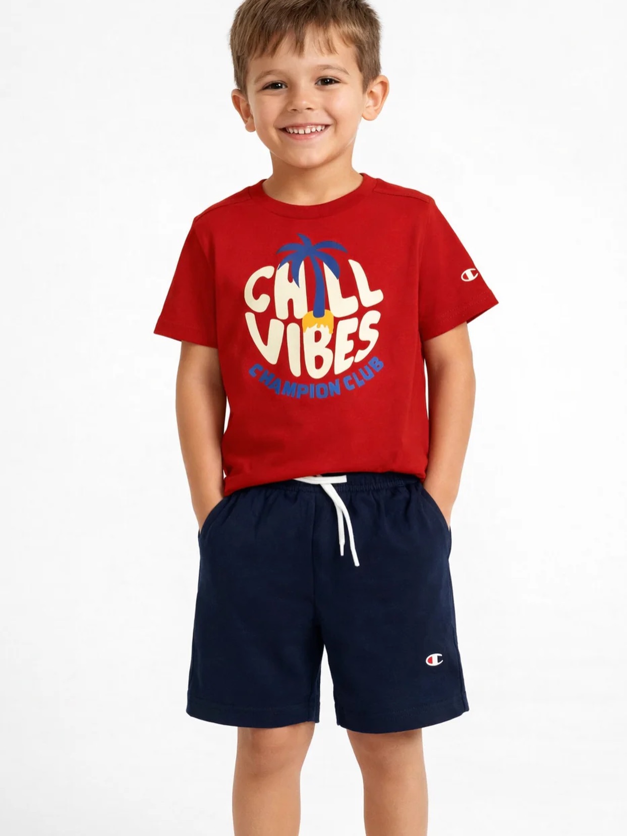 - Πλήρες Σετ: Περιλαμβάνει κόκκινη κοντομάνικη μπλούζα με το λογότυπο Champion και navy μπλε βερμούδα.