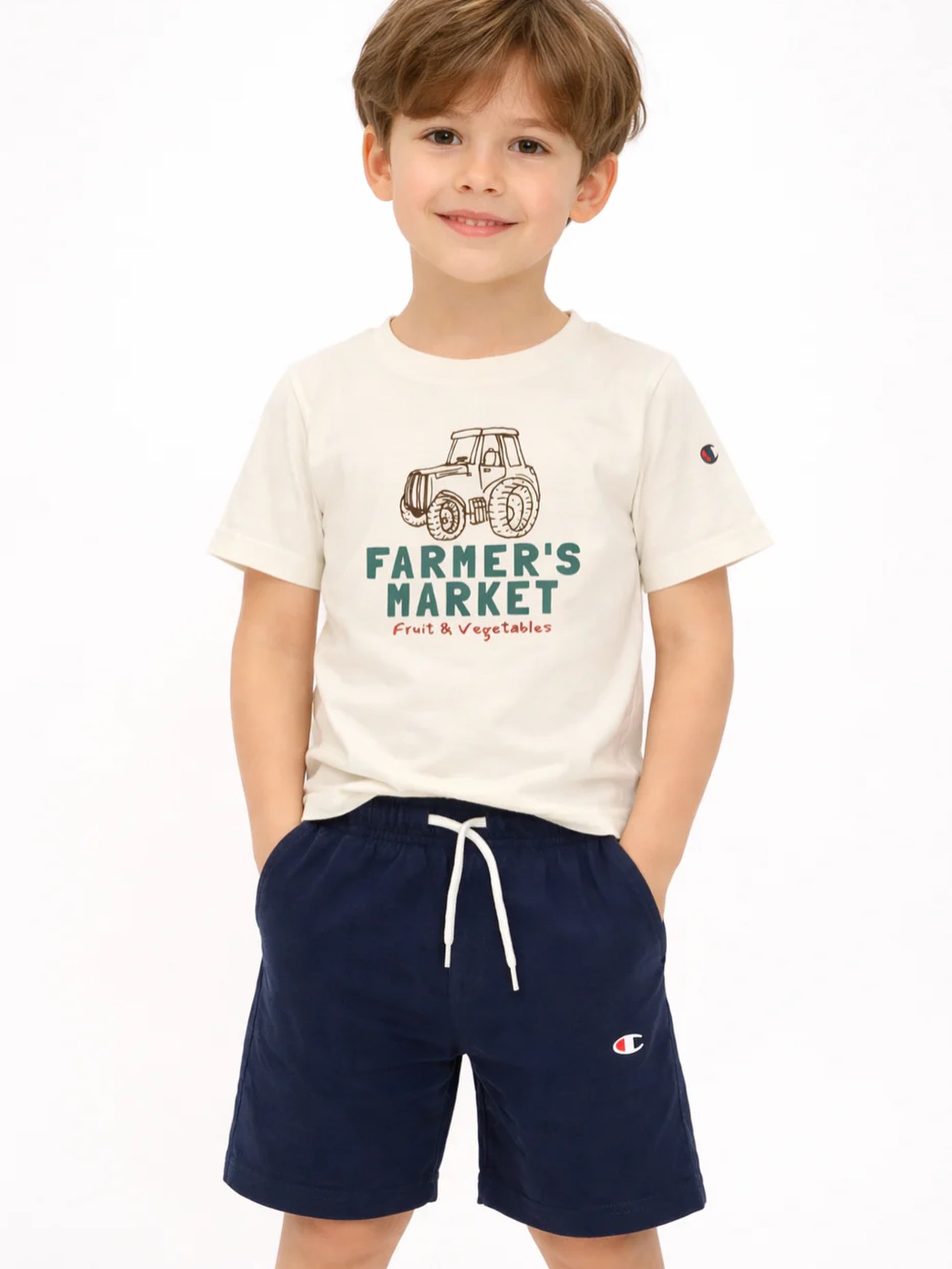 - Σύνθεση: Περιλαμβάνει λευκό κοντομάνικο T-shirt με το αυθεντικό λογότυπο Champion και αθλητικό σορτς σε μπλε χρώμα.